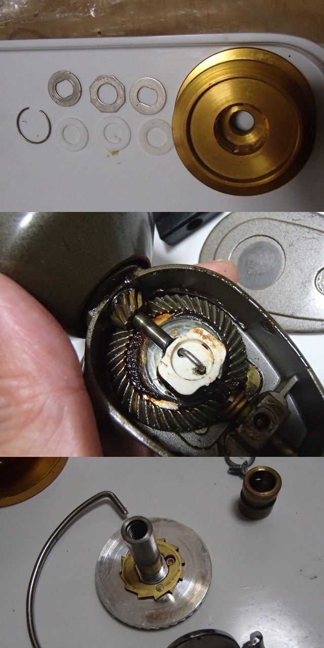 ともあれ、これで全バラし完了することができて、入手したハンドルノブは黒いので元の白いのと付け替えて、ギアはついでにローター軸のも新品に交換しようと思ったら、微妙に高さが合わずにローターが締まって止まってしまう。ワッシャーの厚さか枚数の調整必要な感じだったけどめんどくさいので予備に保管することにしてローター軸のギアは元のをそのまま使うことにした。